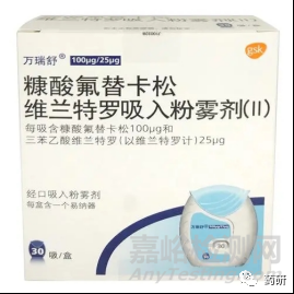 糠酸氟替卡松維蘭特羅吸入粉霧劑上市產(chǎn)品有兩個(gè)規(guī)格分別為:(1)糠酸氟替卡松維蘭特羅吸入粉霧劑(Ⅱ):糠酸氟替卡松100μg與三苯乙酸維蘭特羅(以維蘭特羅計(jì))25μg;(2)糠酸氟替卡松維蘭特羅吸入粉霧劑(Ⅲ):糠酸氟替卡松200μg與三苯乙酸維蘭特羅(以維蘭特羅計(jì))25μg。輔料成分為乳糖(C12H22O11·H2O)和硬脂酸鎂??匪岱婵ㄋ珊腿揭宜峋S蘭特羅分別以泡囊的形式密封于兩條鋁箔條內(nèi),置藥粉吸入器(易納器ELLIPTA)中,泡嚢中的內(nèi)容物為白色粉末。該產(chǎn)品的適應(yīng)癥主要為哮喘和慢性阻塞性肺病(COPD)。本品適用于成人哮喘患者的維持治療,其中包括規(guī)律吸入糖皮質(zhì)激素,并“按需”吸入短效β2-受體激動(dòng)劑治療控制不佳的成人哮喘患者,患者吸入本品后15分鐘內(nèi)通常有肺功能的改善。本品100μg/25μg用于慢性阻塞性肺?。–OPD)的治療,適用于吸入支氣管擴(kuò)張劑后FEV1占正常預(yù)計(jì)值百分比<70%,且規(guī)律應(yīng)用支氣管擴(kuò)張劑治療情況下,仍有急性加重史的成人COPD患者的維持治療,患者吸入本品后16-17分鐘內(nèi)通常有肺功能的改善。