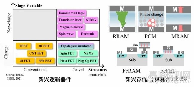 第二條路徑是通過(guò)發(fā)展新原理器件,研發(fā)新材料,實(shí)現(xiàn)單個(gè)晶體管器件的性能提升。隨著鐵電存儲(chǔ)器 FeRAM、阻變存儲(chǔ)器 RRAM、磁存儲(chǔ)器 MRAM、相變存儲(chǔ)器 PCM、鐵電晶體管 FeFET 等多種新原理器件的發(fā)展,結(jié)合寬禁帶半導(dǎo)體、二維材料、碳納米管等新材料的研究,探索超越傳統(tǒng)CMOS 器件性能 / 能效的新型器件和突破馮諾依曼架構(gòu)的新型計(jì)算范式成為一個(gè)重要的研究領(lǐng)域。然而,新原理器件是面向未來(lái)的芯片性能提升發(fā)展路徑,從科學(xué)研究到實(shí)際應(yīng)用的周期通常較長(zhǎng),難以在短時(shí)間內(nèi)解決當(dāng)前高性能集成電路芯片受限的挑戰(zhàn)。