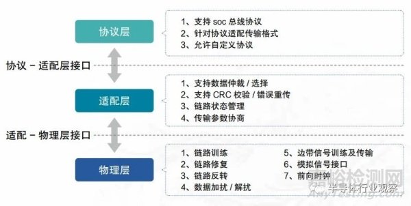 當(dāng)前面向芯粒的接口標(biāo)準(zhǔn)以并行接口為主,且強(qiáng)調(diào)物理接口的模塊化,可以充分利用先進(jìn)封裝的高互連密度特性并最大化接口帶寬。此外 AIB、BOW、HBM、UCIe 等主要接口協(xié)議均采用大寬度單端數(shù)據(jù) + 隨路時(shí)鐘的方案,僅 USR 等少部分協(xié)議采用高速串行數(shù)據(jù) + 時(shí)鐘恢復(fù)方案。在芯粒技術(shù)帶來(lái)的芯片設(shè)計(jì)積木化、敏捷化與定制化的場(chǎng)景下,芯?;ヂ?lián)協(xié)議需與廠商、架構(gòu)、制造工藝解耦,擁有廣泛的兼容性與開(kāi)放性,才能適應(yīng)芯粒異構(gòu)互聯(lián)、跨廠商互聯(lián)的實(shí)際需求。
