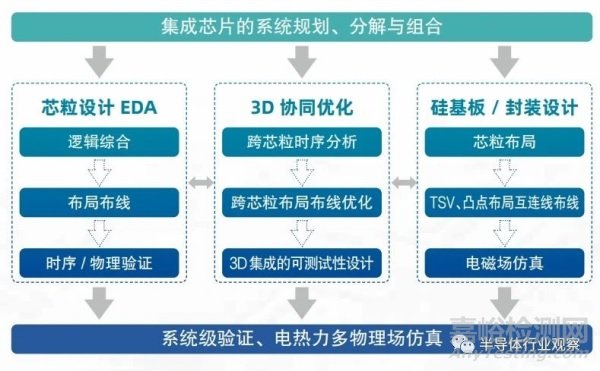(四)3D 協(xié)同優(yōu)化設(shè)計(jì):用于在芯粒和基板封裝設(shè)計(jì)后的協(xié)同優(yōu)化與驗(yàn)證,如芯粒 - 基板互連后的跨芯粒時(shí)序分析、布局布線優(yōu)化,同時(shí)還需要考慮 3D 集成的可測(cè)性設(shè)計(jì),因?yàn)樵?3D 集成后部分芯粒已無(wú)對(duì)外直接可測(cè)的引腳,需專用方案;