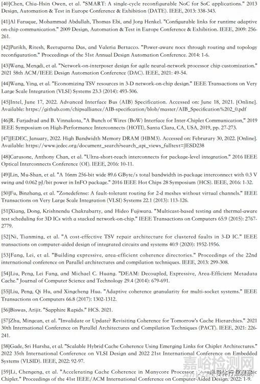 容錯(cuò)路由是指在芯粒間的互連設(shè)計(jì)中,通過(guò)設(shè)計(jì)能夠應(yīng)對(duì)永久性故障導(dǎo)致的網(wǎng)絡(luò)變化的路由算法,提升系統(tǒng)的容錯(cuò)性能。當(dāng)網(wǎng)絡(luò)中出現(xiàn)錯(cuò)誤時(shí),路由算法需要具備適應(yīng)網(wǎng)絡(luò)變化的能力,并自適應(yīng)的執(zhí)行不同的路由策略以繞過(guò)或避免故障區(qū)域的通信,這也是容錯(cuò)路由的重要研究方向。為了提升錯(cuò)誤處理能力,容錯(cuò)路由算法可以采取以下策略:(1)動(dòng)態(tài)路徑選擇。路由算法可以根據(jù)實(shí)時(shí)的網(wǎng)絡(luò)狀態(tài)和錯(cuò)誤信息,動(dòng)態(tài)選擇最佳路徑來(lái)繞過(guò)故障區(qū)域。這可以通過(guò)監(jiān)測(cè)鏈路狀態(tài)、節(jié)點(diǎn)負(fù)載、延遲等指標(biāo)來(lái)實(shí)現(xiàn)。路由算法可以基于這些信息做出即時(shí)的路由決策,將數(shù)據(jù)流量導(dǎo)向可用的路徑。(2)基于負(fù)載均衡的路由。當(dāng)網(wǎng)絡(luò)中出現(xiàn)故障時(shí),路由算法可以考慮負(fù)載均衡策略來(lái)選擇路徑。它可以根據(jù)節(jié)點(diǎn)的負(fù)載狀況,選擇相對(duì)較空閑的路徑進(jìn)行通信,以避免將更多的流量導(dǎo)向已經(jīng)過(guò)載或故障的區(qū)域。國(guó)內(nèi)中科院計(jì)算所早期在研究 3D TSV 設(shè)計(jì)時(shí),針對(duì) TSV 提出了復(fù)用容錯(cuò)的技術(shù)思路 [44]和容錯(cuò) NOC 設(shè)計(jì) [50],清華大學(xué)、合肥工業(yè)大學(xué)等也有相關(guān)研究 [51][52]。