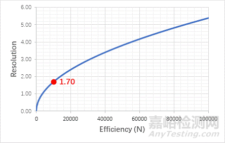 根據圖1分所揭示的數學關系,我們可利用此公式預判改變柱效N后獲得的分離度Rs。例如,某物質在4.6*250mm,5um的色譜柱上的分離度為1.0,嘗試更換為同款4.6*250mm,3um的色譜柱。由公式推算可知,更換后其達到的分離度約為1.3。因此,利用此公式通過對分離度的預判,可避免不必要的試驗。