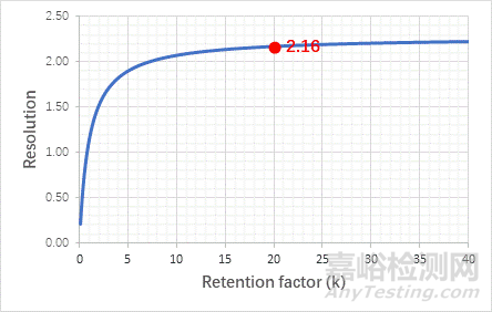 由圖3可知,當保留因子K≤5時,通過改變K值,分離度都能得到極大的改善。當保留因子K≥10,通過改變K值,分離度得到的改善卻極小。因此,方法開發(fā)過程中,如果色譜峰的保留因子K≤5,此時通過改變K值便能有效的改善分離。如果色譜峰的保留因子K≥10,此時通過改變保留因子K將會收效甚微。因此當保留因子K≥10時,改變其他參數將會更加有效。