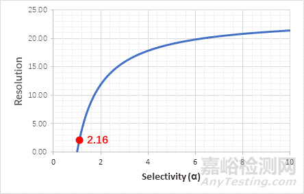 由圖可知,當選擇性1≤α≤2時,通過改變α值,分離度都能得到極大的改善。當選擇性α≥6時,通過改變α值,分離度Rs得到的改善相對變小。比較圖2、圖3及圖5縱坐標分離度Rs數值可知,影響分離的三要素中,選擇性α對分離的影響是最大的。即使選擇性α的微小改變,也能帶來分離度Rs的巨大改變。所以,選擇性α是改善分離度Rs的最有效方法。
