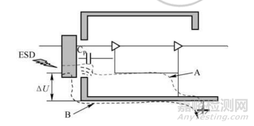 在 ΔU 存在的情況下,必然導(dǎo)致一部分靜電放電電流經(jīng)分布電容Cp流向地平面, 最后流向大地,如圖中虛線 A 所示。