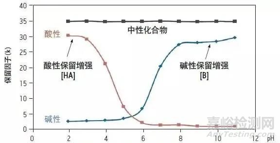 當(dāng)分析物含有可電離官能團(tuán)時(shí)(可電離官能團(tuán)指,在不同的pH條件下可處于不同程度的電離狀態(tài),例如:伯/仲/叔胺基、羧酸基、酚酸基),pH條件將強(qiáng)烈影響分析物的反相保留效果,pH條件的改變也會(huì)造成最強(qiáng)烈的選擇性改變效果。酸性和堿性化合物在其未電離狀態(tài)下時(shí)反相保留最大,中性化合物的保留不受pH影響。
