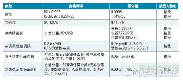 通過使用包括摸索試驗(yàn)和驗(yàn)證的方法可明顯提高色譜測(cè)試方法的開發(fā)效率。設(shè)計(jì)試驗(yàn)研究包括影響選擇性的多個(gè)參數(shù),例如固定相、pH值、有機(jī)改性劑,自動(dòng)化運(yùn)行極大加速了測(cè)試方法開發(fā)流程。合理審視數(shù)據(jù)后,完成最終測(cè)試方法經(jīng)常是微調(diào)和優(yōu)化如梯度坡度和溫度等變量的過程。為了保證所開發(fā)的方法能夠滿足應(yīng)用要求,需要使用前面確定的性能參數(shù)對(duì)方法進(jìn)行驗(yàn)證。驗(yàn)證結(jié)果-使用Empower方法驗(yàn)證管理器對(duì)帕羅西汀方法的驗(yàn)證結(jié)果如下: