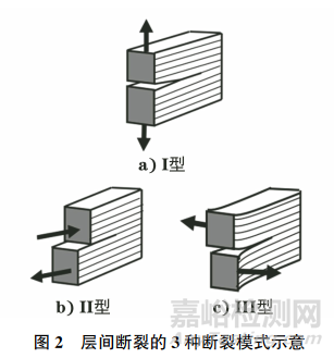 層間斷裂韌性是表征復(fù)合材料抗分層擴(kuò)展能力的重要指標(biāo)之一,斷裂模式有I型(裂紋擴(kuò)展)、II型(面內(nèi)剪切)和Ⅲ型(面外剪切),3種斷裂模式如圖2所示。
