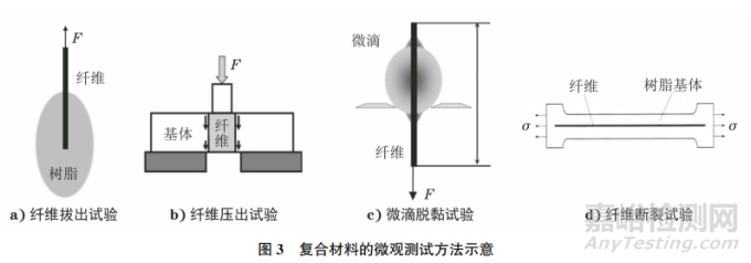 微觀測(cè)試包括纖維拔出試驗(yàn)、纖維壓出試驗(yàn)、微滴脫黏試驗(yàn)、纖維斷裂試驗(yàn)等(見圖3),試驗(yàn)均以單纖維為研究對(duì)象。纖維頂出試驗(yàn)、纖維拉出試驗(yàn)、微滴包埋試驗(yàn)等都是將力直接施加在纖維上,而纖維斷裂試驗(yàn)是將力施加在樹脂基體上。微滴脫黏法的制樣過程相對(duì)簡(jiǎn)單,可以準(zhǔn)確地測(cè)量出脫黏瞬間結(jié)合力的大小,適合測(cè)試任何纖維/基體間的界面結(jié)合強(qiáng)度。這些方法還沒有具體可以參照的測(cè)試標(biāo)準(zhǔn),其測(cè)試結(jié)果的精確度受制樣方法以及儀器的精確度影響較大。