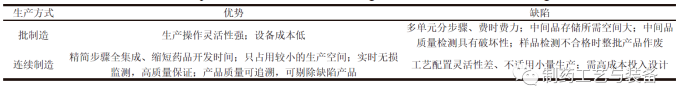 目前,藥品生產(chǎn)以批制造為主,即將原材料輸送到單個(gè)單元操作中,通過離線分析測(cè)試中間產(chǎn)品的質(zhì)量,滿足質(zhì)量要求后,物料才可以被轉(zhuǎn)移到下一個(gè)單元操作,整個(gè)過程較為煩瑣(見表1)。相比于批制造,連續(xù)制造(continuous manufacturing,CM) 是將間歇式單元操作整合為連續(xù)生產(chǎn)線,結(jié)合過程分析技術(shù)(process analysis technology,PAT)實(shí)時(shí)監(jiān)測(cè)和控制原材料、中間產(chǎn)品和最終藥品的關(guān)鍵過程參數(shù)(critical process parameters,CPPs) 和關(guān)鍵質(zhì)量屬性(critical quality attributes,CQAs),同時(shí)借助前饋、反饋系統(tǒng)在線監(jiān)控以及調(diào)整中間體和成品的質(zhì)量,使原輔料和終產(chǎn)品能以相同的速度進(jìn)出生產(chǎn)線,生產(chǎn)迅速且產(chǎn)品質(zhì)量一致性高,可實(shí)現(xiàn)實(shí)時(shí)放行測(cè)試,更加符合制藥工業(yè)4.0理念。