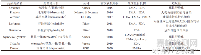 2015年7月,由福泰制藥(Vertex) 研發(fā)的Orkambi 經(jīng)FDA 批準(zhǔn)上市。Orkambi 是由魯瑪卡托(lumacaftor) 和依伐卡托(ivacaftor) 組成的復(fù)方藥物,用于治療囊性纖維化,是第一個(gè)通過連續(xù)制造工藝生產(chǎn)的OSD 產(chǎn)品。截至目前,已有8種采用連續(xù)制造生產(chǎn)的藥品被FDA、歐洲藥品管理局(European Medicines Agency,EMA) 或日本醫(yī)療器械審評(píng)審批機(jī)構(gòu)(Pharmaceuticals and Medical Devices Agency,PMDA) 批準(zhǔn)上市[5—6],如表2 所示。