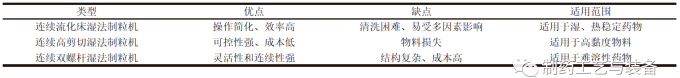 制粒是藥物制劑生產(chǎn)中重要的操作步驟之一[13—14],在顆粒劑、片劑中應(yīng)用廣泛,可改善物料流動(dòng)性、調(diào)整堆密度。制粒方法有濕法制粒和干法制粒,其中濕法制粒應(yīng)用較多。目前已有多種類型的連續(xù)濕法制粒機(jī),如連續(xù)流化床濕法制粒機(jī)、連續(xù)高剪切濕法制粒機(jī)和連續(xù)雙螺桿濕法制粒機(jī)等,其適用性對(duì)比見表3。