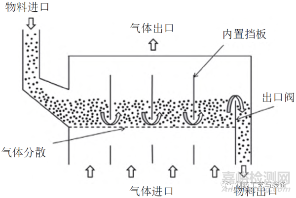 藥物中含有的水分是影響最終產(chǎn)品質(zhì)量的關(guān)鍵因素,含水量過高易導(dǎo)致結(jié)塊、發(fā)霉、變質(zhì)等,因此干燥也是制藥生產(chǎn)中不可或缺的工藝步驟。流化床干燥技術(shù)是一種新型干燥技術(shù),其過程是將散狀物料置于孔板上,再?gòu)南虏枯斔蜔峥諝?,使物料顆粒在氣流中呈懸浮狀態(tài),與氣體充分接觸,進(jìn)行物料與氣體之間的熱傳遞和水分傳遞,干燥后被排出。與傳統(tǒng)干燥技術(shù)(烘箱干燥、托盤干燥)相比,連續(xù)流化床干燥在制粒、包衣等過程中的適用性更廣、傳熱性能更好,且物料可連續(xù)進(jìn)入和排出。圖3為一種常見的水平式連續(xù)流化床的原理圖[20],由1個(gè)狹長(zhǎng)的長(zhǎng)方體處理室構(gòu)成,固體藥物在水平方向上連續(xù)流動(dòng),在連續(xù)運(yùn)行時(shí)可獲得較高收率。