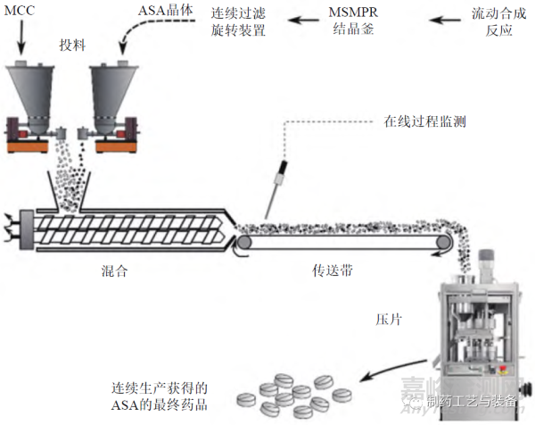 DOMOKOS 等在概念驗(yàn)證水平上開展了用于常規(guī)壓片的固體制劑端到端連續(xù)制造的研究,如圖5所示[25]。首先,乙酰水楊酸(acetylsalicylic acid,ASA) 的流動(dòng)合成反應(yīng)混合物在混合懸浮混合排料(mixed suspension mixed product removal,MSMPR)結(jié)晶釜中連續(xù)結(jié)晶,該結(jié)晶釜直接與連續(xù)過濾旋轉(zhuǎn)裝置相連,用于ASA 晶體的過濾和干燥;過濾后的材料通過螺旋給料機(jī)和微晶纖維素(MCC) 一起加入連續(xù)攪拌機(jī)中,通過集成的在線NIR 探頭監(jiān)測(cè)粉末混合物的均勻性;隨后通過帶式輸送機(jī)將物料送入偏心型壓片機(jī)中進(jìn)行片劑的連續(xù)制造,通過離線的HPLC 法檢測(cè)最終片劑中藥物的含量及均勻性。