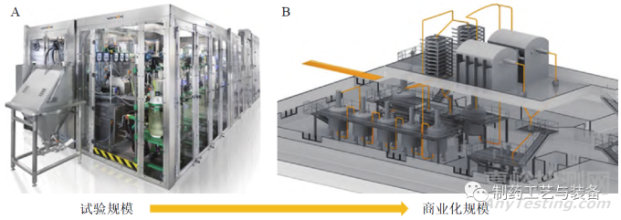 圖6 試驗(yàn)工廠(A) 和按比例擴(kuò)大的商業(yè)cGMP 生產(chǎn)線(B) 的布局[26]
