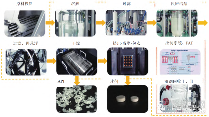 端到端連續(xù)制造過程指從連續(xù)多步合成原料藥到最終劑型成型的整個(gè)生產(chǎn)過程。第一個(gè)以端到端連續(xù)制造過程生產(chǎn)的藥品是阿利吉侖片,該片劑生產(chǎn)過程集成了原料藥的合成(化學(xué)合成、分離、結(jié)晶、干燥) 和片劑生產(chǎn)過程(混合、雙螺桿熱熔擠出、包衣),減少了操作單元,大幅降低了生產(chǎn)成本。