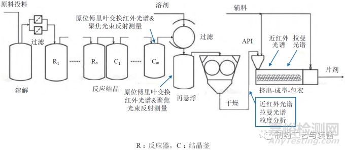 該工廠包括以下操作:溶解和過濾、反應(yīng)結(jié)晶、過濾、干燥、擠出成型包衣(extrusion-moldingcoating,EMC)、溶劑回收以及相關(guān)的過程控制系統(tǒng)(DeltaV) 和PAT(如圖7所示)。DeltaV 過程控制系統(tǒng)的交互式、可調(diào)整、靈活的圖形用戶界面可用于過程監(jiān)控操作,通過實(shí)時(shí)調(diào)整過程參數(shù)來確保產(chǎn)品質(zhì)量。該試驗(yàn)工廠的另一重要組成是PAT(如圖8所示),可允許實(shí)時(shí)在線監(jiān)測(cè)CQAs 和關(guān)鍵物料屬性(critical material attributes,CMAs),以激活前饋和反饋控制;存在偏差時(shí),控制系統(tǒng)可根據(jù)參數(shù)選擇是否保留或轉(zhuǎn)移物料,防止不合格物料進(jìn)入下游制造過程,從而確保最終API 或藥品的質(zhì)量,實(shí)現(xiàn)實(shí)時(shí)放行測(cè)試。