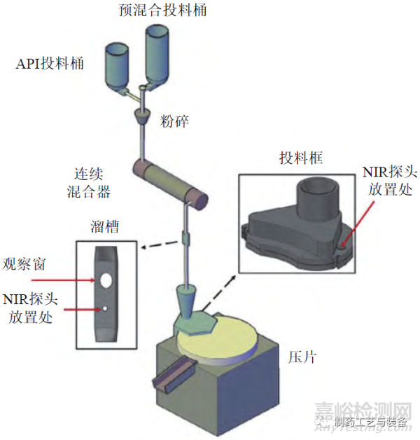 圖9 NIR在連續(xù)直接壓片的實(shí)時(shí)監(jiān)測(cè)應(yīng)用中探頭位置示意圖示[28]