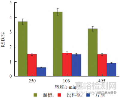 圖10 不同攪拌轉(zhuǎn)速下溜槽、投料框內(nèi)和片劑中藥物濃度RSD的比較(對(duì)乙酰氨基酚質(zhì)量分?jǐn)?shù)為10%)[28]