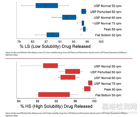 方差分析表明,在正常設置條件下,在50rpm/min下獲得的LS釋放量與在60rpm/min和75rpm/min下獲得的LS釋放量在95%置信水平上有顯著差異。在正常設置和溶出杯傾斜的擾動條件下獲得的LS釋放也有顯著差異。然而,在75rpm/min的正常設置和50rpm/min的擾動條件下獲得的結果沒有顯著性差異。