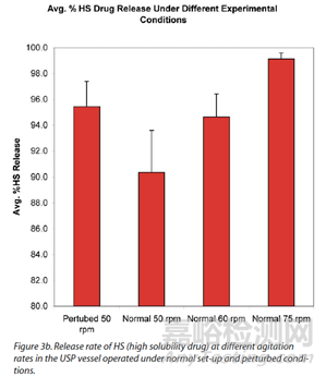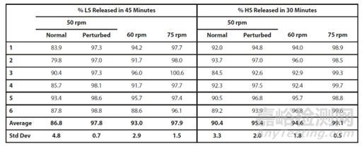 在正常設置下,HS釋放的平均百分比為90.4%,標準差為3.3%。60 rpm和75 rpm時HS釋放量分別為94.6%±1.8%和99.1%±0.5%。在擾動條件下,傾斜溶出杯在50 rpm下運行,HS釋放為95.4%±2.0%。數(shù)據(jù)圖如圖3b所示。