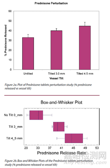 在正常(無干擾)裝置設置下,潑尼松釋放度只有30.0±3.1%。當溶出杯傾斜(擾動)3.0 mm和4.5 mm時,釋放率分別為40.0±2.2%和44.7±3.9%。(注:除另有說明外,每個實驗用6片,n=6)。釋放速率的逐漸增強意味著當溶出杯傾斜時,溶出杯底部的流量增加。這反過來又破壞了錐體,使更多的藥物暴露在溶出介質(zhì)中,使藥物進入溶液。對傾斜(mm)與溶出率進行線性回歸分析。相關系數(shù)(r)為0.997,表明在研究范圍內(nèi)溶出率隨溶出杯傾斜度的增加呈線性增加。