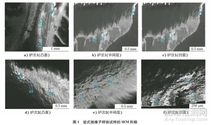 分別在不同澆注爐次(爐次1和爐次2)的盆式絕緣子凸面、中間層、凹面的碎塊上取樣,對試樣進行掃描電鏡(SEM)及能譜分析,結(jié)果如圖1和表1所示。由圖1和表1可知:爐次1中碎塊試樣的C元素質(zhì)量分數(shù)為58.45%~76.12%,O元素質(zhì)量分數(shù)為19.51% ~32.84%,Al元素質(zhì)量分數(shù)為0.37%~5.06%;爐次2中碎塊試樣的C元素質(zhì)量分數(shù)為61.49% ~76.35%,O元素質(zhì)量分數(shù)為20.81%~34.42%,Al元素質(zhì)量分數(shù)為0.11% ~4.42%,盆式絕緣子凸面、中間層、凹面處的化學成分沒有明顯差異。