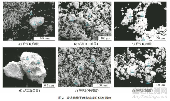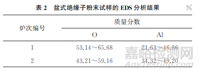 考慮到放電時瞬時溫度較高,會對盆式絕緣子產(chǎn)生燒灼,造成成分比例改變,因此對2個爐次的碎塊進行坩堝試驗。將碎塊放在坩堝內(nèi)并標記爐次,然后放置在高溫爐內(nèi),設定溫度為700℃,經(jīng)12h高溫燒灼后,碎塊變成粉末狀,對粉末試樣進行SEM及EDS分析,結(jié)果如圖2和表2所示。由圖2和表2可知:爐次1中粉末試樣的O元素質(zhì)量分數(shù)為53.14%~65.68%,Al元素質(zhì)量分數(shù)為21.63%~46.86%;爐次2中粉末試樣O元素質(zhì)量分數(shù)為43.21% ~59.16%,Al元素質(zhì)量分數(shù)為34.32%~49.20%。