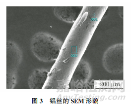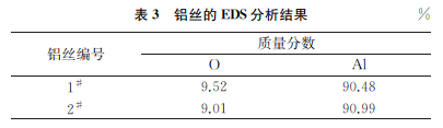 選取鋁絲為外來金屬異物,使用潤滑脂將鋁絲黏附在盆式絕緣子表面,充入SF6氣體,模擬GIS設備實際工況,進行雷電沖擊和工頻試驗,使用導電膠帶對放電后的產(chǎn)物進行成分分析,選取6根鋁絲,編號為1#~6#,6根鋁絲的規(guī)格均為0.13mm×3mm(直徑×長度),對鋁絲進行SEM及EDS分析,鋁絲中Al元素的質(zhì)量分數(shù)大于90%(見圖3及表3)。