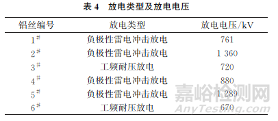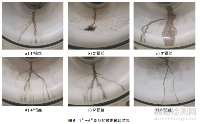 盆式絕緣子凹面的場強較高,絕緣裕度較小,疊加合成場強的法向數(shù)值較大,吸附異物能力強,有較高的放電風險。因此,將1#~6#鋁絲黏附在盆式絕緣子凹面進行放電試驗,鋁絲黏附位置如圖4所示,放電類型及電壓如表4所示,放電試驗結(jié)果如圖5所示。由圖5可知:鋁絲放電后在盆式絕緣子上形成了放電通道,放電紋路呈樹枝狀或傘狀。