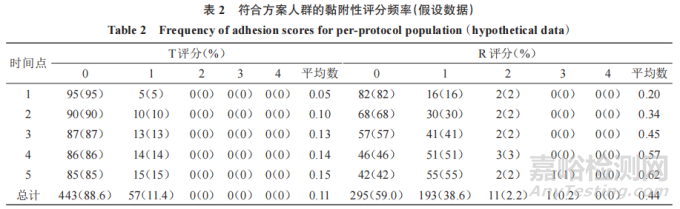 此外,申請(qǐng)人應(yīng)在頻率表中提交描述性黏附性評(píng)分?jǐn)?shù)據(jù),說(shuō)明在每個(gè)評(píng)估時(shí)間點(diǎn)和所有時(shí)間點(diǎn)的每個(gè)黏附性評(píng)分的 T和 R TDS的數(shù)量和比例。表2是頻率表的樣式,以n=100計(jì)算T評(píng)分、R評(píng)分。