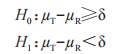 分別是 T 和 R 產(chǎn)品平均黏附性評(píng)分的群體平均數(shù),以及替代假設(shè) H1表示 T產(chǎn)品的黏附性相對(duì)于 R 產(chǎn)品的黏附性的 NI。這些假設(shè)對(duì)應(yīng)于下列內(nèi)容: