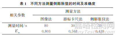 不同方法測(cè)量側(cè)膨脹值的時(shí)間及準(zhǔn)確度如表1所示。由表1可知:游標(biāo)卡尺法測(cè)量用時(shí)最短,為30s,使用游標(biāo)卡尺法可顯著提高工作效率,側(cè)膨脹值法所用時(shí)間為50s,圖像法測(cè)量用時(shí)最長(zhǎng);3種方法的測(cè)量準(zhǔn)確度均較好,其中側(cè)膨脹值法的測(cè)量準(zhǔn)確度最高。