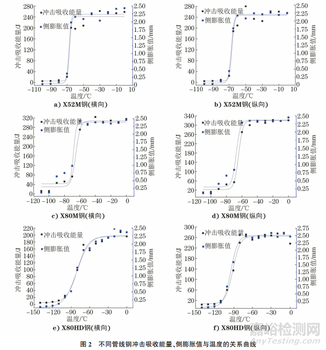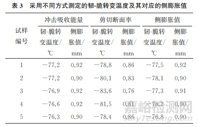 (2)對(duì)于管線鋼,采用側(cè)膨脹值測(cè)定其韌-脆轉(zhuǎn)變溫度的準(zhǔn)確性和穩(wěn)定性較好。