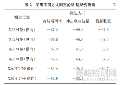 2.2 管線鋼韌-脆轉(zhuǎn)變溫度測(cè)定方式對(duì)比