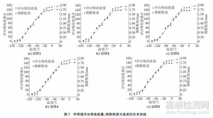 焊縫組織極不均勻,斷面上的結(jié)晶狀脆性區(qū)與纖維狀韌性區(qū)不易區(qū)分,僅以剪切斷面率測(cè)定的溫度作為韌-脆轉(zhuǎn)變溫度會(huì)導(dǎo)致偏差較大。因此,采用沖擊吸收能量、剪切斷面率、側(cè)膨脹值3種方法測(cè)定韌-脆轉(zhuǎn)變溫度后,對(duì)擬合曲線中的原始數(shù)據(jù)進(jìn)行分析,確認(rèn)韌-脆轉(zhuǎn)變時(shí)對(duì)應(yīng)的側(cè)膨脹值是否具有一致性。