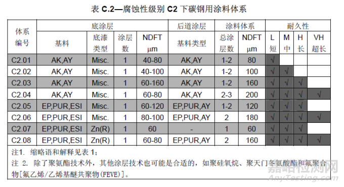 根據(jù)基材選用標(biāo)準(zhǔn)推薦最小的涂層體系,標(biāo)準(zhǔn)里面涂層體系都是結(jié)合現(xiàn)場應(yīng)用經(jīng)驗和按ISO12944-6實驗室性能測試結(jié)果給出的,具有很好的參考價值。如以下表C2表: