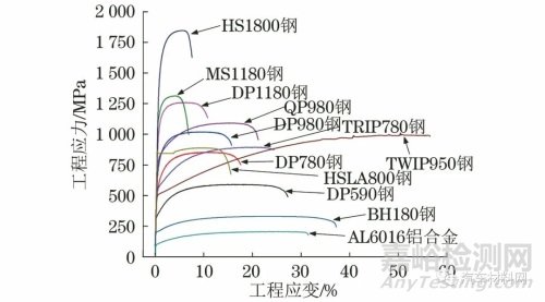 圖2 不同材料的拉伸工程應(yīng)力-應(yīng)變曲線