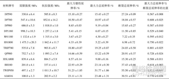 (1) 汽車用板材在拉伸過程中的斷裂通常發(fā)生在均勻變形結(jié)束后,最大力總延伸率反映了材料的硬化與均化應(yīng)變的能力,不是材料塑性的直接指標(biāo)。較高的最大力總延伸率表明材料具有較好的持續(xù)硬化能力。材料的斷裂總延伸率與硬化能力具有強相關(guān)性。