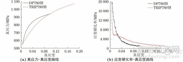 圖3 DP780鋼與TRIP780鋼在均勻變形階段的真應(yīng)力-真應(yīng)變曲線與應(yīng)變硬化率-真應(yīng)變曲線