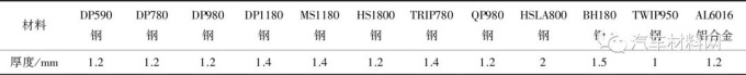 試驗材料包括DP590鋼、DP780鋼、DP980鋼、DP1180鋼、MS1180鋼、HS1800鋼、TRIP780鋼、QP980鋼、TWIP950鋼、HSLA800鋼、BH180鋼、AL6016鋁合金,均為商用冷軋板,厚度如表1所示。其中:DP590鋼、DP780鋼、DP980鋼、DP1180鋼為不同強度級別的雙相鋼;MS1180鋼為馬氏體鋼,HS1800鋼是經(jīng)過熱處理后的熱成型鋼,組織為馬氏體;TRIP780鋼、QP980鋼、TWIP950鋼是利用奧氏體或者殘余奧氏體的相變誘導(dǎo)塑性、孿晶誘發(fā)塑性效應(yīng)開發(fā)的先進(jìn)高強鋼;HSLA800鋼為高強低合金鋼;BH180鋼為烘烤硬化高強鋼。