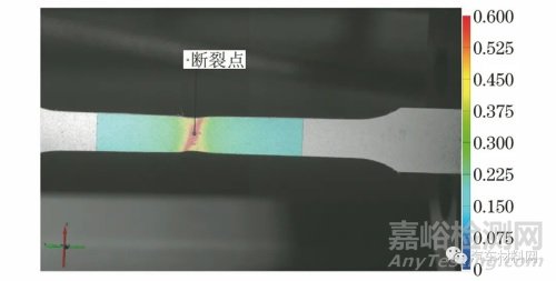 圖4 DIC得到DP590鋼在拉伸斷裂前一幀的表面應(yīng)變分布云圖