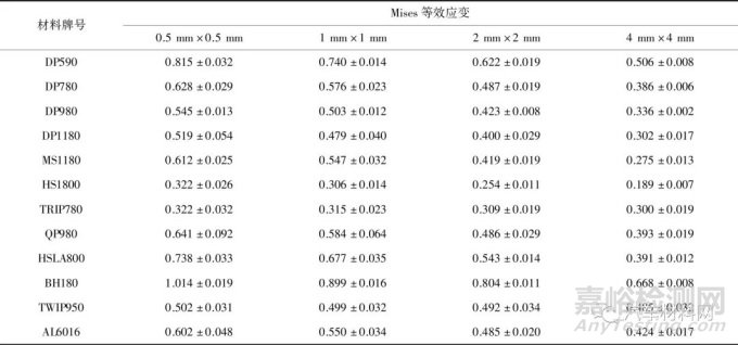 Table 3 Fracture Mises effective strains of different regions of different materials