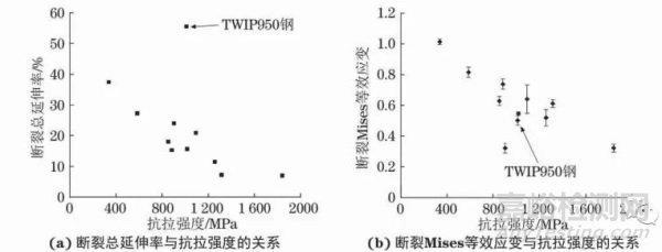 圖6 所有材料的斷裂總延伸率與抗拉強度的關(guān)系以及斷裂Mises等效應(yīng)變與抗拉強度的關(guān)系
