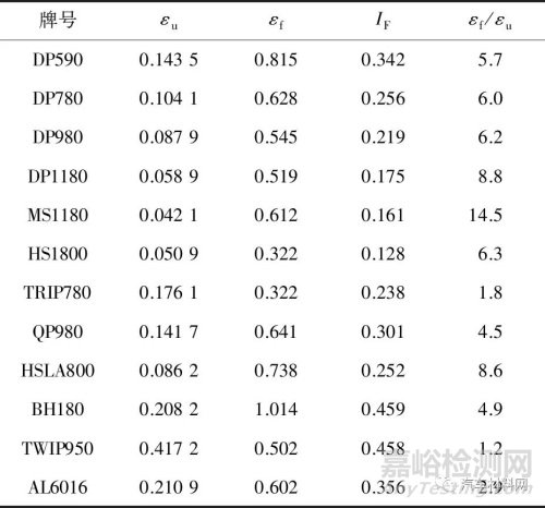 (2) 汽車用板材的斷裂應(yīng)變通常要遠(yuǎn)大于材料的斷裂總延伸率,斷裂應(yīng)變與斷裂總延伸率不完全正相關(guān)。相比于斷裂總延伸率,斷裂應(yīng)變與強度更符合負(fù)相關(guān)的關(guān)系;斷裂應(yīng)變表征材料的真實塑性。