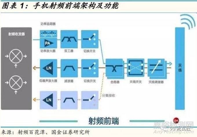 射頻前端芯片包括功率放大器(PA),天線開(kāi)關(guān)(Switch)、濾波器(Filter)、雙工器(Duplexer 和 Diplexer)和低噪聲放大器(LNA)等,在多模/多頻終端中發(fā)揮著核心作用。
