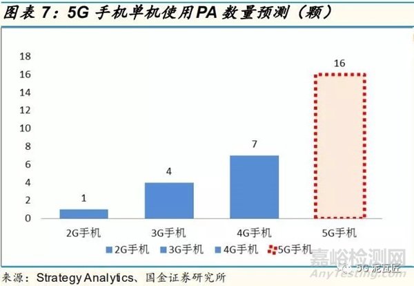 5G 手機(jī)功率放大器(PA)用量翻倍增長(zhǎng):PA 是一部手機(jī)最關(guān)鍵的器件之一,它直接決定了手機(jī)無(wú)線通信的距離、信號(hào)質(zhì)量,甚至待機(jī)時(shí)間,是整個(gè)射頻系統(tǒng)中除基帶外最重要的部分。手機(jī)里面 PA 的數(shù)量隨著 2G、3G、4G、5G 逐漸增加。以 PA 模組為例,4G 多模多頻手機(jī)所需的 PA 芯片為5-7 顆,預(yù)測(cè) 5G 手機(jī)內(nèi)的 PA 芯片將達(dá)到 16 顆之多。