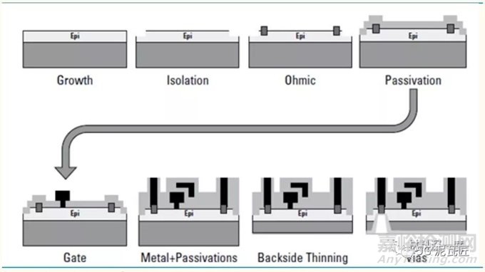 典型的 GaN 射頻器件的加工工藝,主要包括如下環(huán)節(jié):外延生長(zhǎng)-器件隔離-歐姆接觸(制作源極、漏極)-氮化物鈍化-柵極制作-場(chǎng)板制作-襯底減薄-襯底通孔等環(huán)節(jié)。