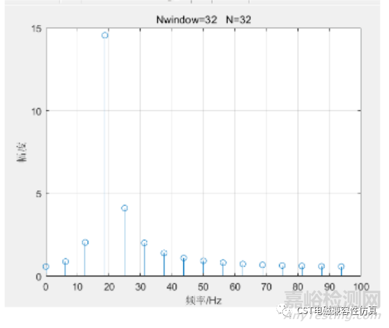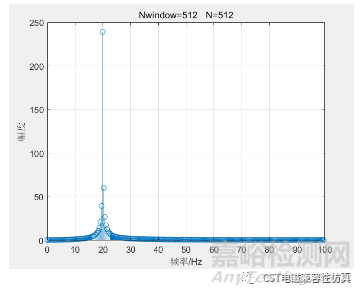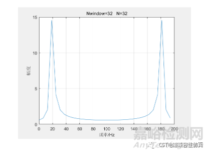 如下圖,我們對(duì)一個(gè)頻率為20Hz的單頻三角函數(shù)加矩形窗做fs=200的32點(diǎn)fft運(yùn)算,可以看到,不僅20Hz除有頻譜成分,其他頻率成分上也有,這就叫做頻譜泄露。