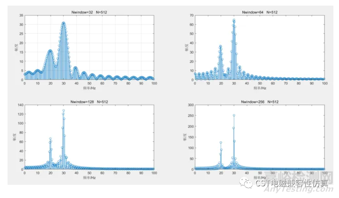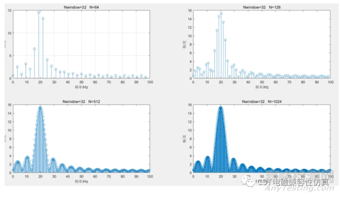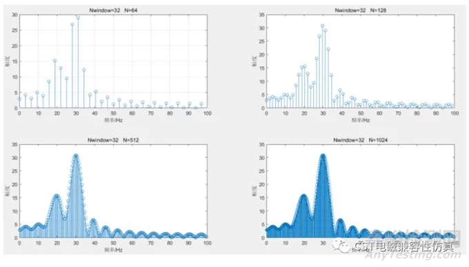 我們可以看到,通過補(bǔ)零只能把圖像變得更平滑,但是無法增大把20Hz,30Hz這兩個(gè)單頻信號(hào)分開的能力。接下來我們?cè)黾訒r(shí)域有效采樣點(diǎn)數(shù),觀察效果。